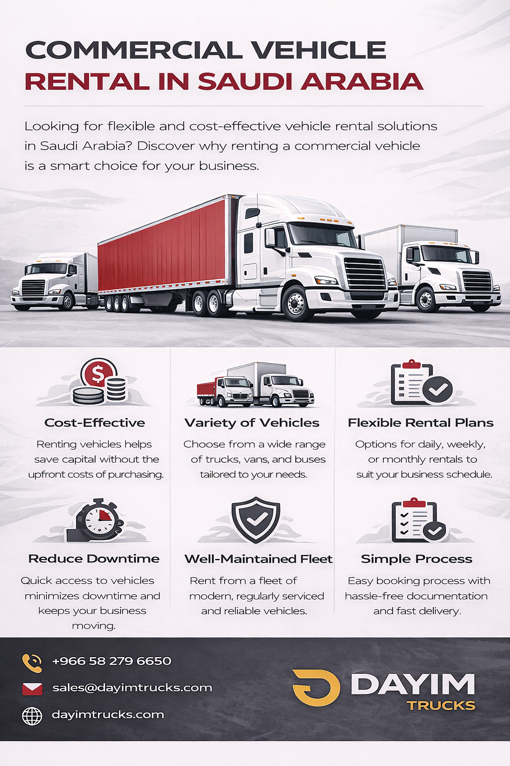 Discover dependable commercial vehicle rental services in Saudi Arabia designed for businesses of all sizes. Access modern trucks, flexible plans, and cost-effective fleet solutions that keep your operations moving efficiently and professionally.