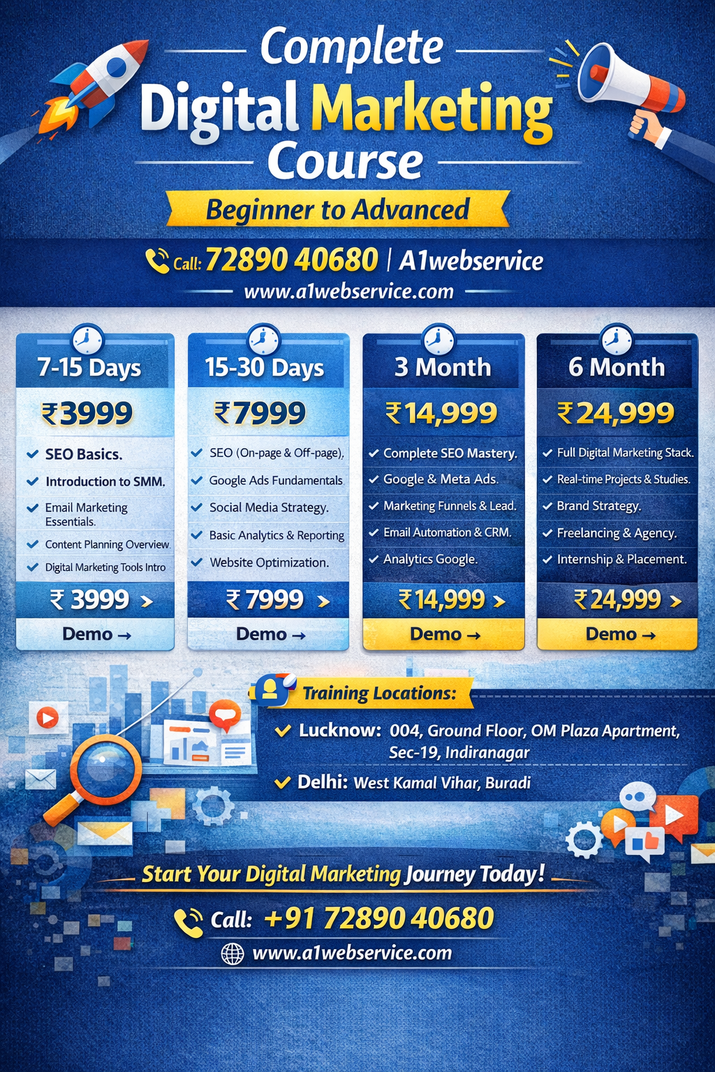 https://www.a1webservice.com/online-courses - Master digital marketing from basics to advanced with practical, real-world strategies that drive results. Enroll today and boost your career or business growth! 📞 72890 40680