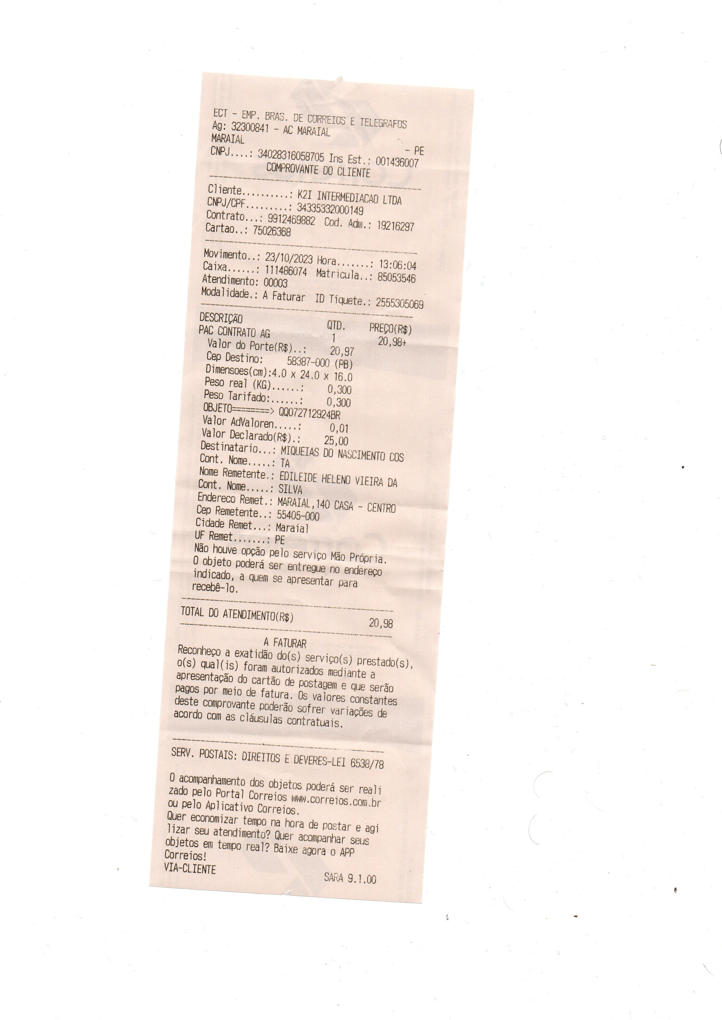 comprovante de postagem