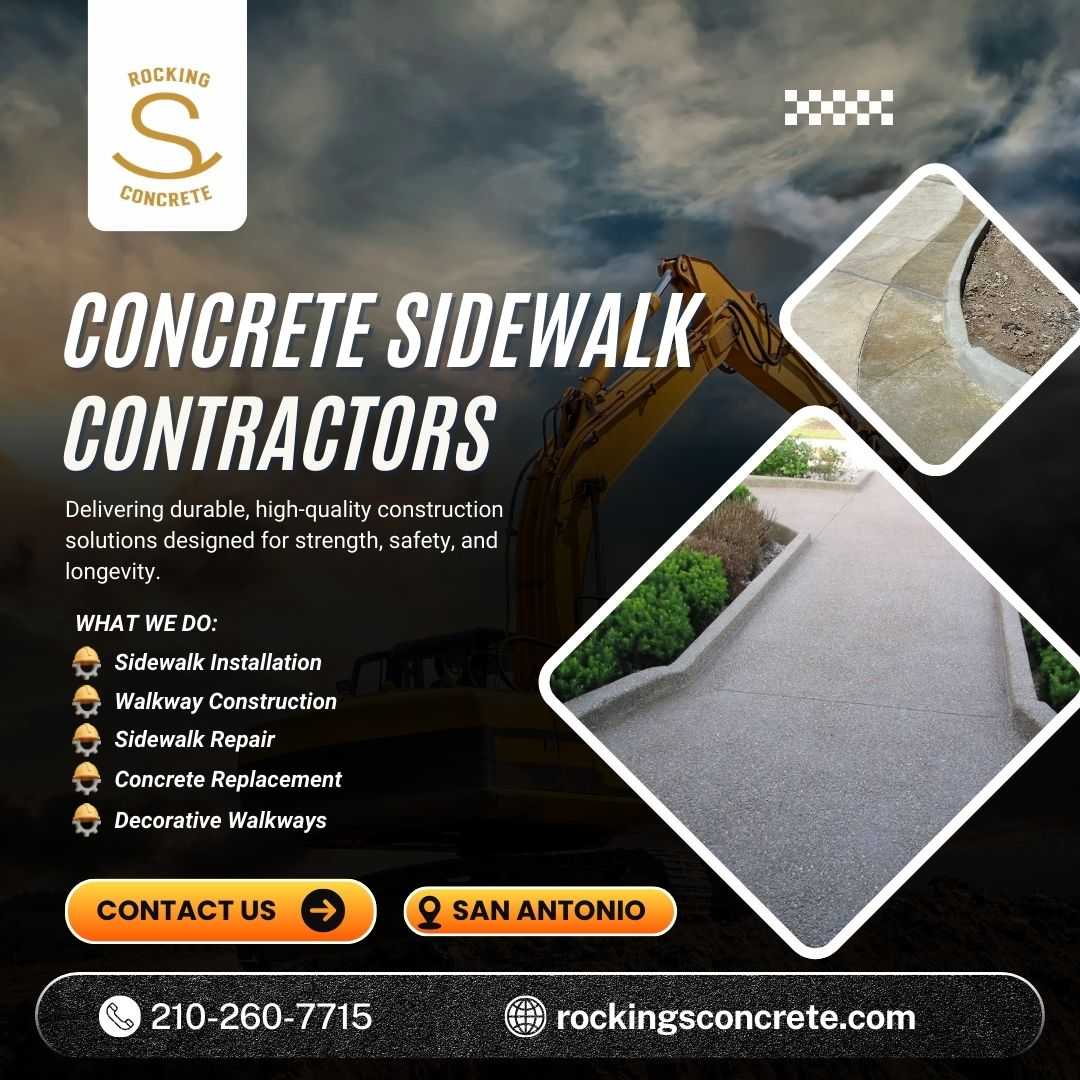 Uneven sidewalks create hazards and reduce property appeal. Safe, accessible walkways require expert grading, reinforcement, and finishing. Rocking S Concrete is a trusted concrete sidewalk contractor in San Antonio, delivering smooth, durable sidewalks designed for heavy foot traffic and long-term reliability. Improve pedestrian safety, drainage, and property value with professionally installed concrete solutions built to last.Get started on your concrete project today.