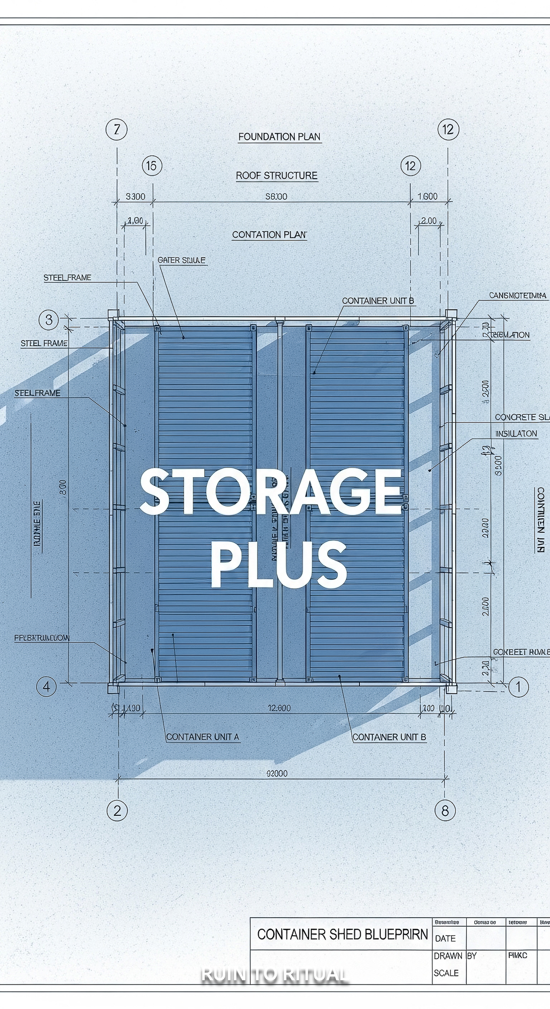 Container shed blueprint with dual function text overlay Storage Plus