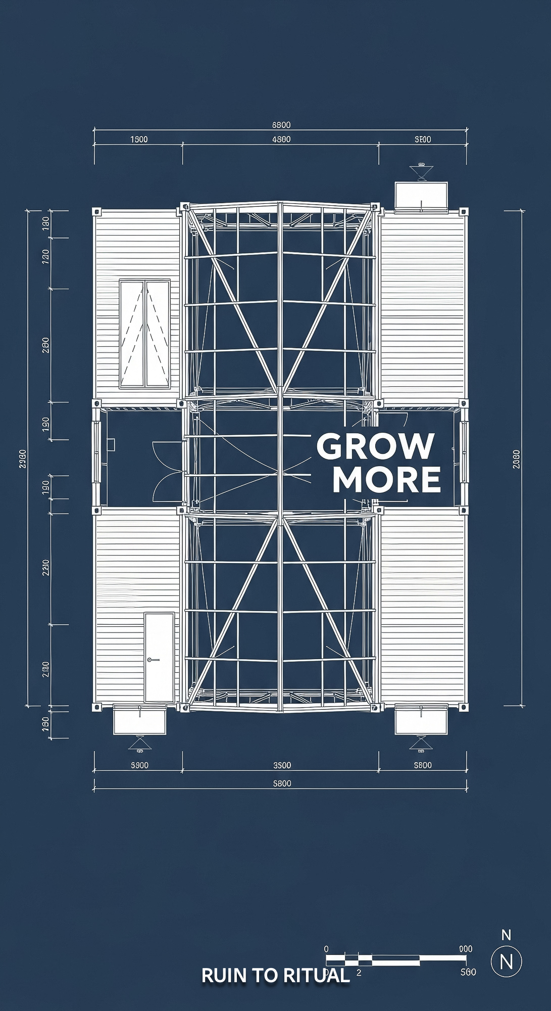 Container shed plan with greenhouse roof text overlay Grow More