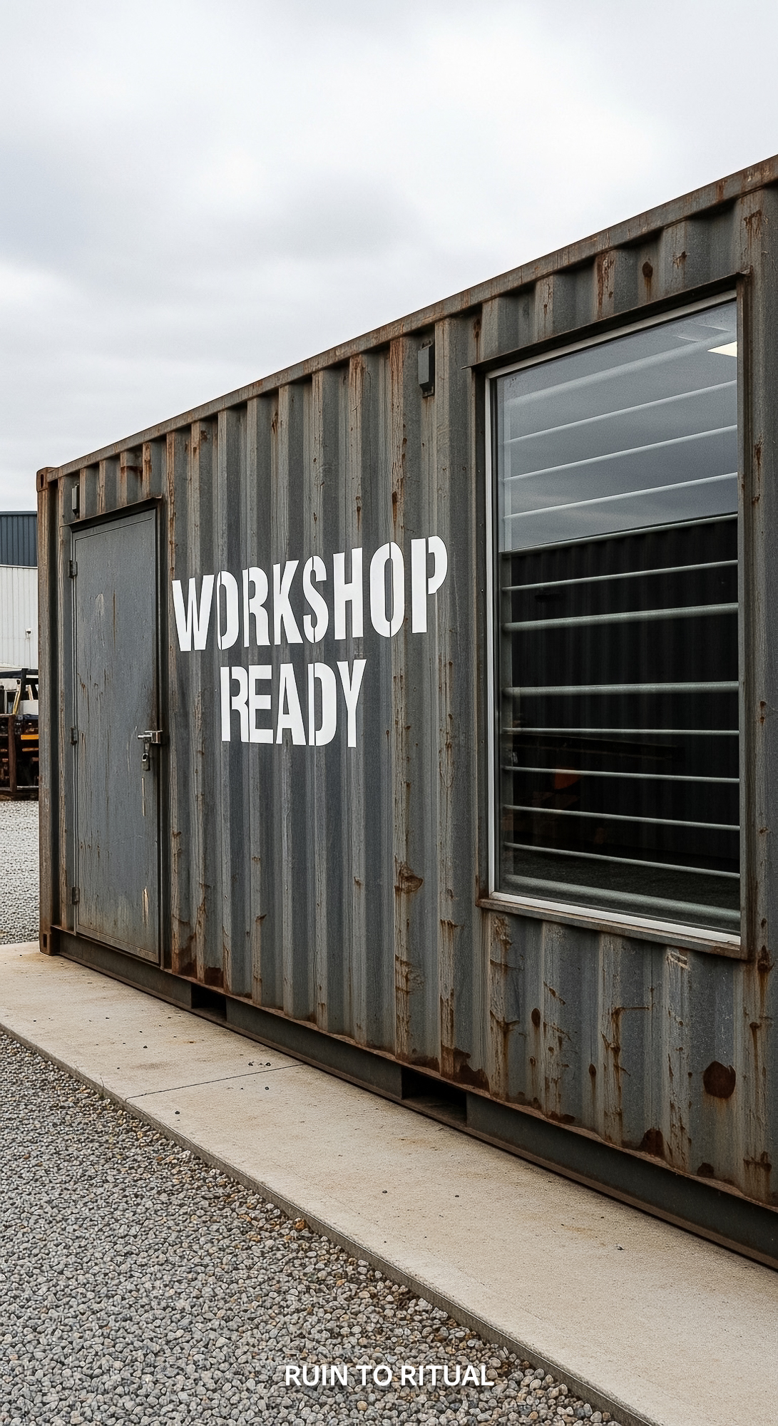 Container shed with industrial look text overlay Workshop Ready