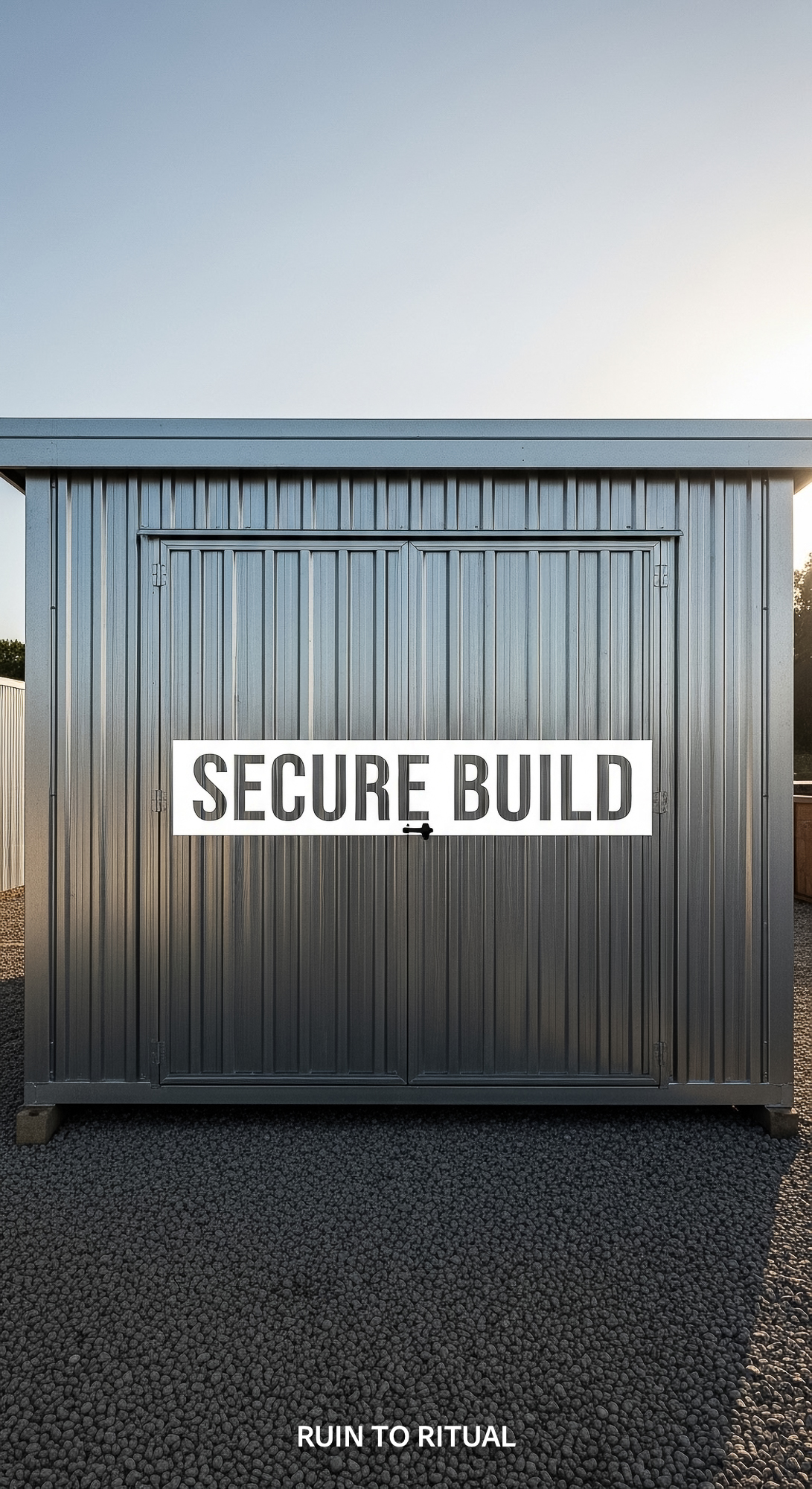Container shed with steel doors text overlay Secure Build