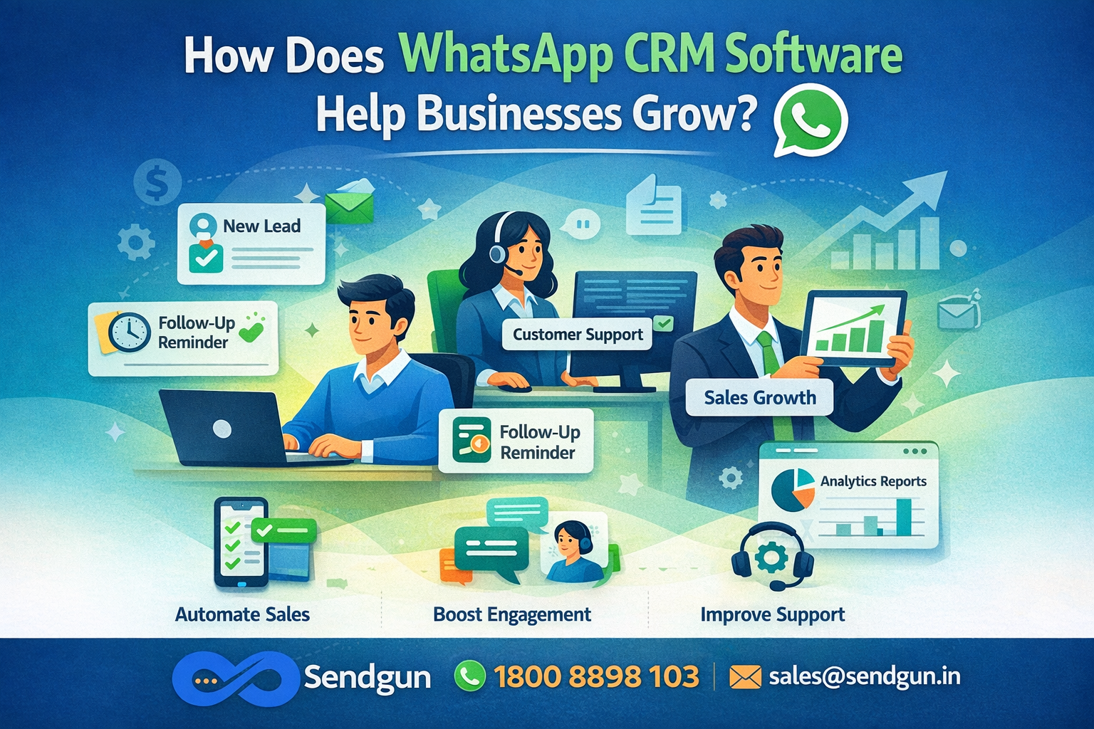 With Sendgun WhatsApp CRM software, businesses can capture leads instantly and nurture them with automated follow-ups. As a trusted WhatsApp CRM provider, Sendgun ensures faster responses, better lead tracking, and improved conversion rates. Sales teams can focus on closing deals while Sendgun handles automation, chat organization, and analytics, making it an ideal solution for growth-focused businesses. https://sendgun.in/products/whatsapp-crm/