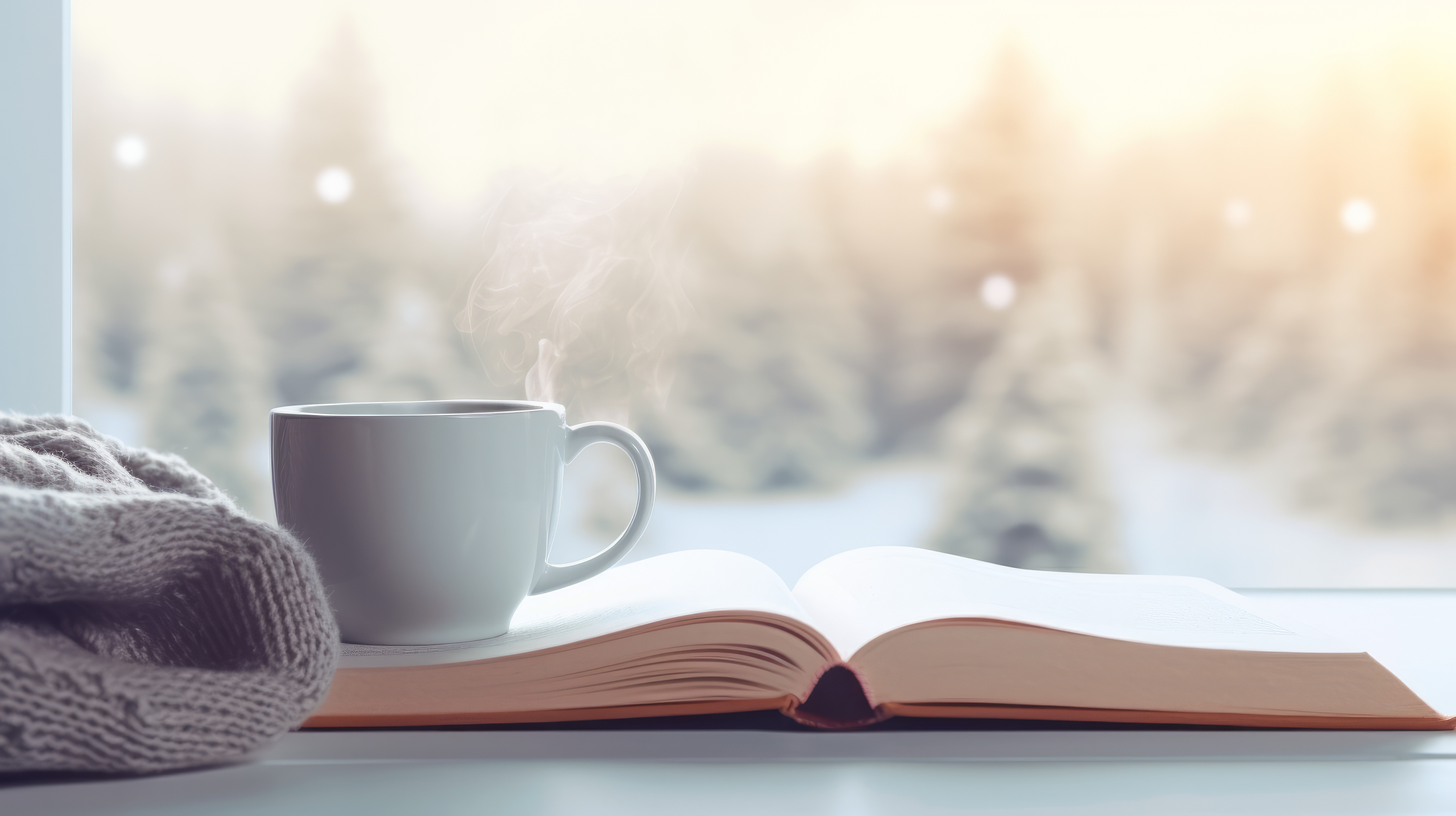 Cozy home still cup of hot coffee and opened book with warm plaid on windowsill against snow landsca