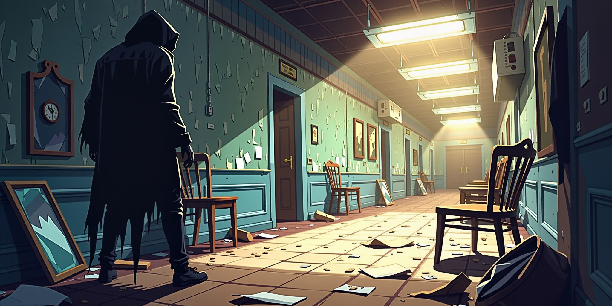Create a haunting illustration that evokes a sense of dread and unease The scene is set in a dimly l