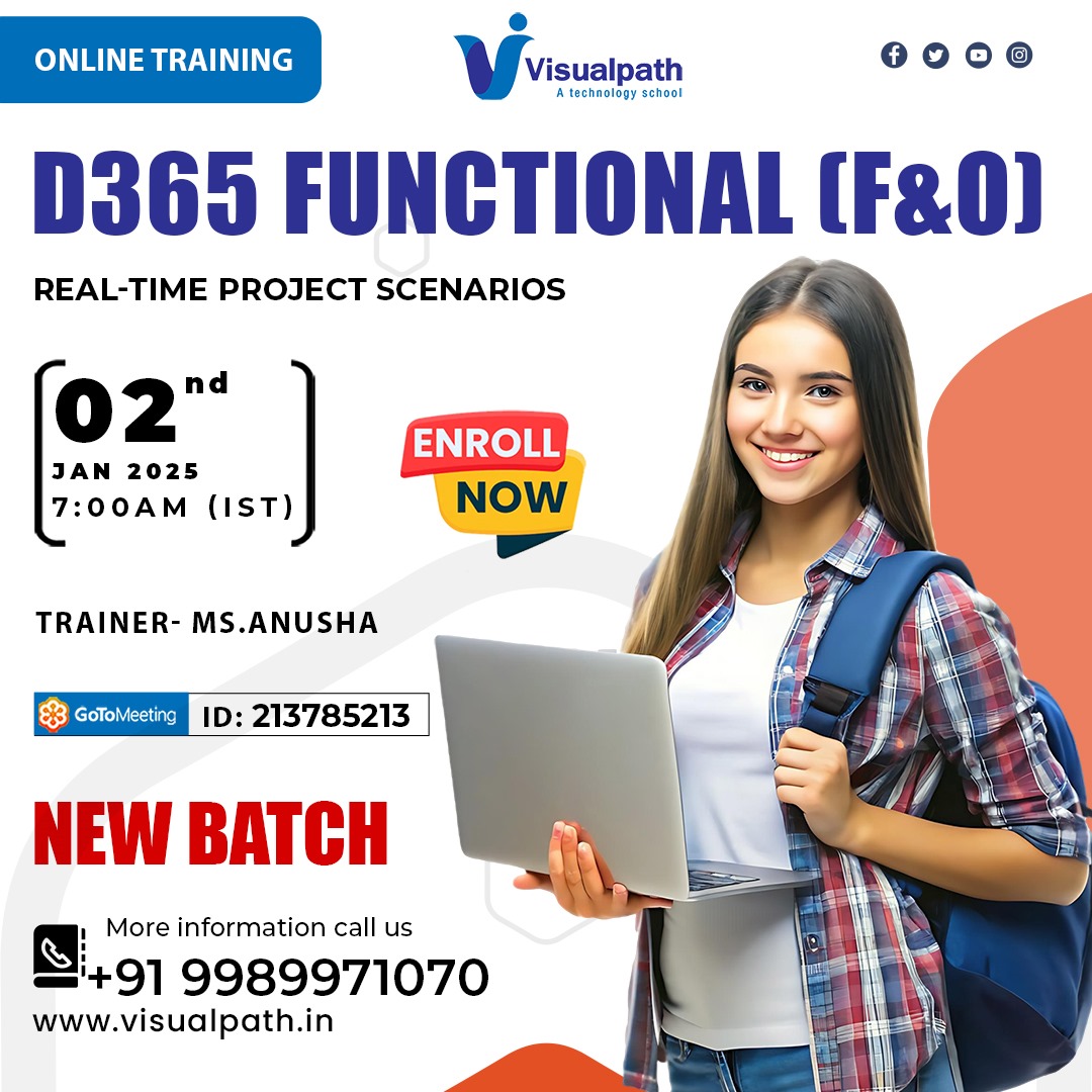 D365 Functional F&O Online New Batch Join Now: https://meet.goto.com/213785213 Attend Online #New Batch on #D365 Functional F&O By Ms.Anusha. Demo on: 02nd Jan 2025, @ 07:00 AM (IST) Contact us: +91- 9989971070 WhatsApp:https://www.whatsapp.com/catalog/919989971070/ Visit:https://www.visualpath.in/online-microsoft-dynamics-365-training-in-hyderabad.html