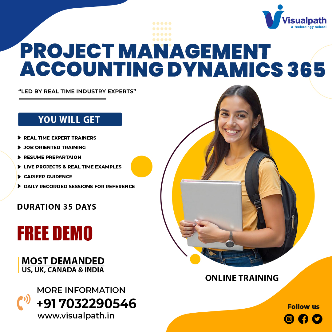 Visualpath offers top-notch D365 Project Management and Accounting Training in Hyderabad. This course is ideal for professionals from the USA, UK, Canada, Dubai, Australia, and globally. Master project management and accounting with real-time examples and live projects. Learn from experts and boost your career in Dynamics 365. Contact +91-7032290546 for a free demo session today