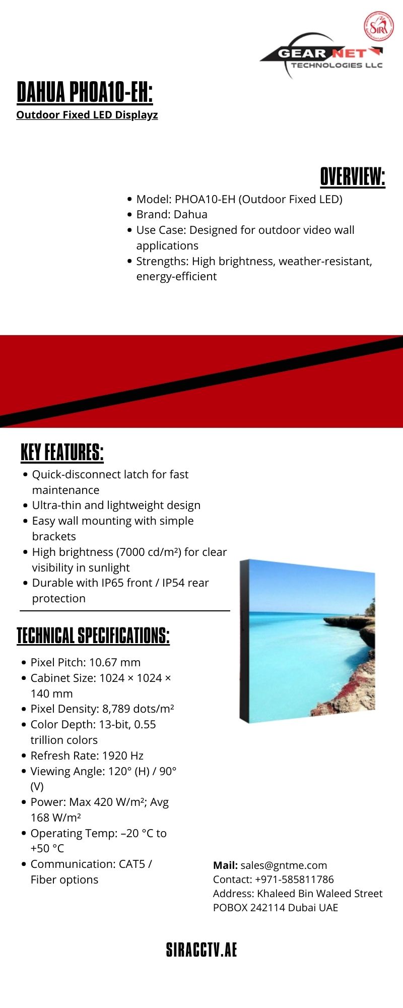 Explore the PHOA10-EH Dahua Display & Control LED Display—SIRA-approved, high-quality visual control panel from Gear Net Technologies in UAE. PHOA10-EH https://siracctv.ae/product/phoa10-eh/ Mail: sales@gntme.com Contact: +971-585811786 Address: Khaleed Bin Waleed Street POBOX 242114 Dubai UAE
