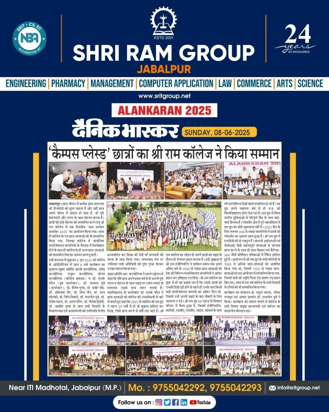 Dainik Bhaskar, one of the esteemed newspapers of Jabalpur Madhya Pradesh recently featured a glimpse of Alankaran 2025. It is a felicitation program and a memorable event organized at SRIT engineering college in Jabalpur.