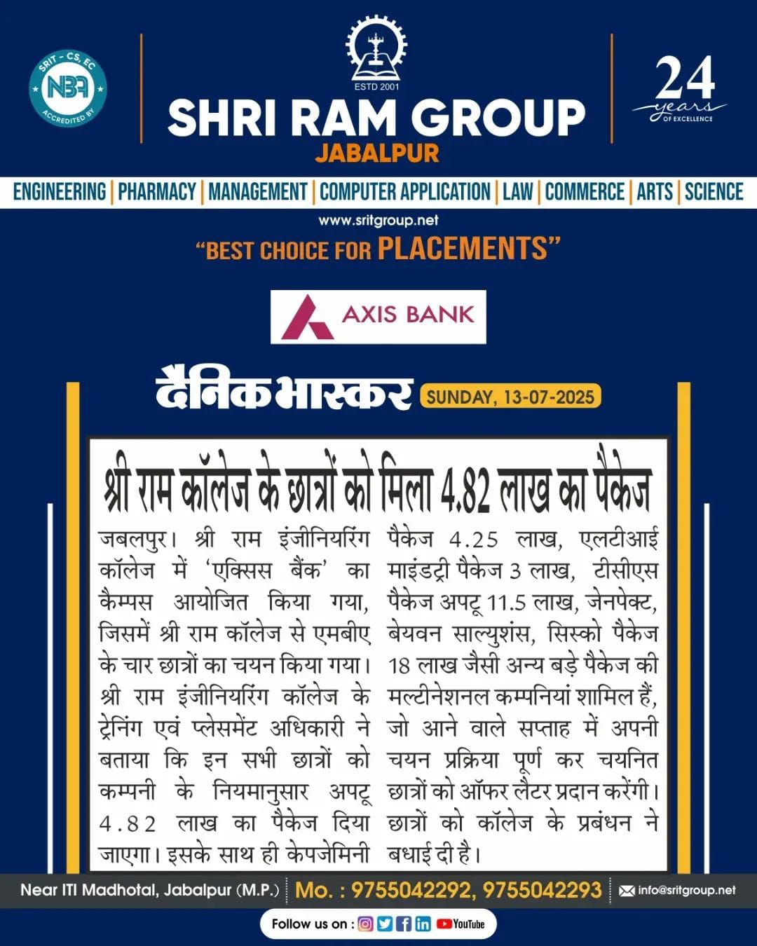 Shri Ram Group Jabalpur feels proud to announce its students’ campus placements at Axis Bank with a highly impressive package up to Rs 4.82 LPA. Listed among the top 10 engineering colleges in Jabalpur, the announcement in Dainik Bhaskar will boost the career aspirations of engineering, management, pharmacy, and other students of the institute.