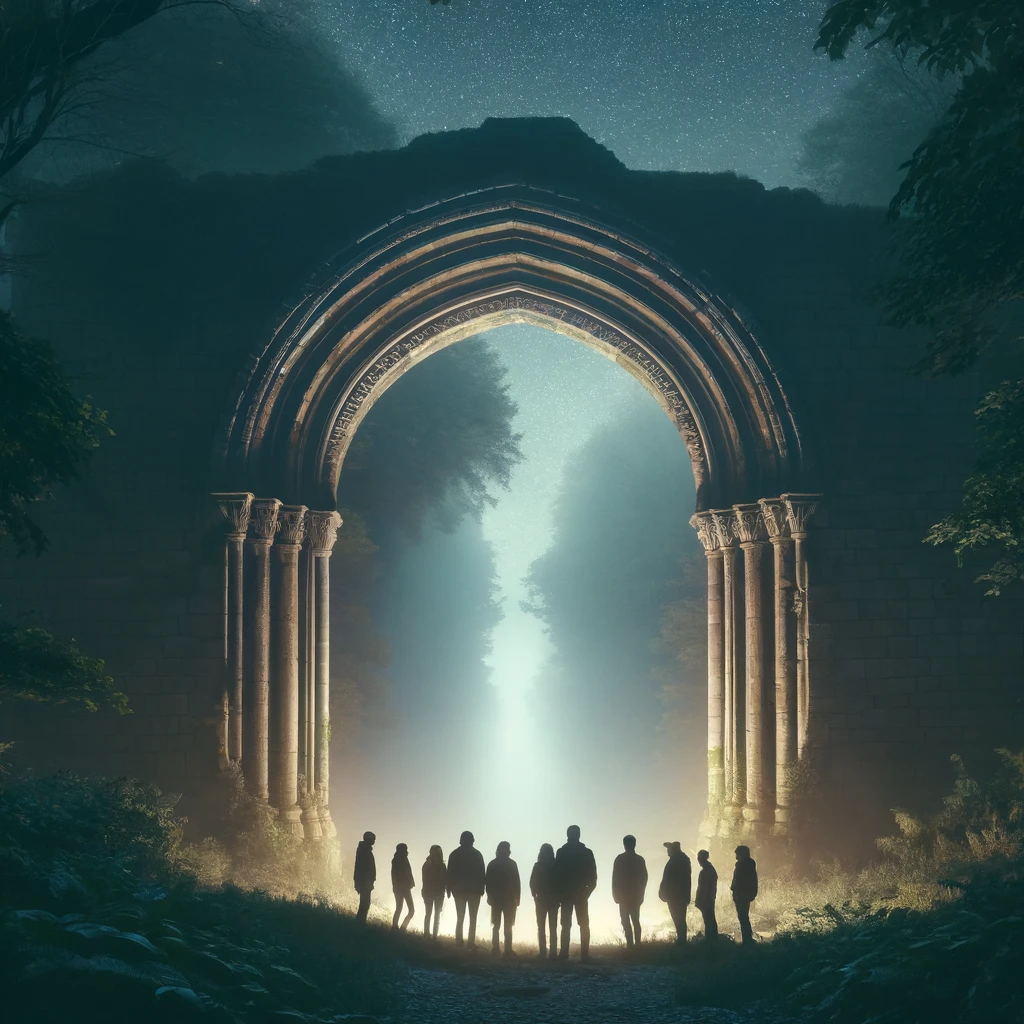 DALL·E 2024 06 07 15.40.36 A group of people standing in front of an ancient, arched stone gate in a