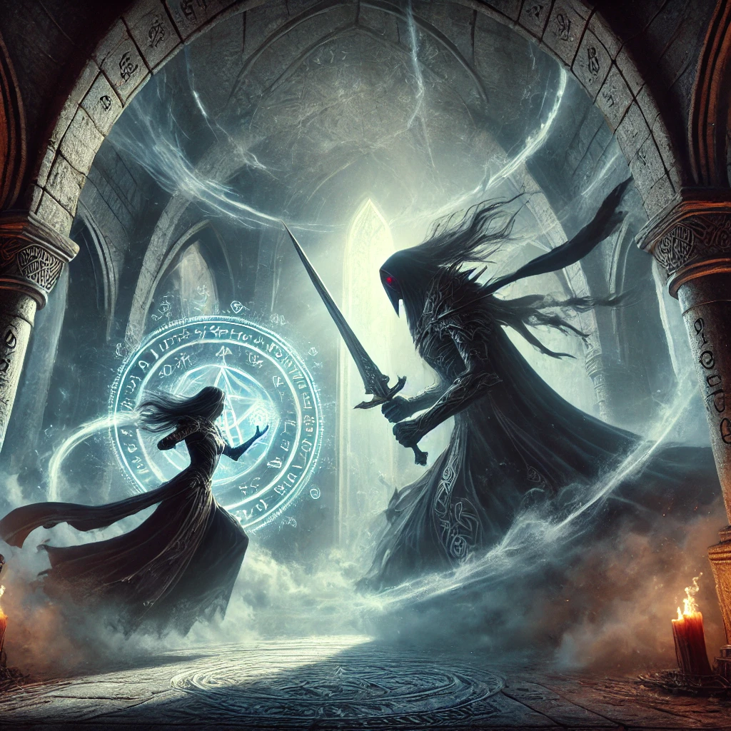DALL·E 2025 02 23 18.19.48 An intense battle inside the Tower of Astralis. Lyra, a fierce warrior wi