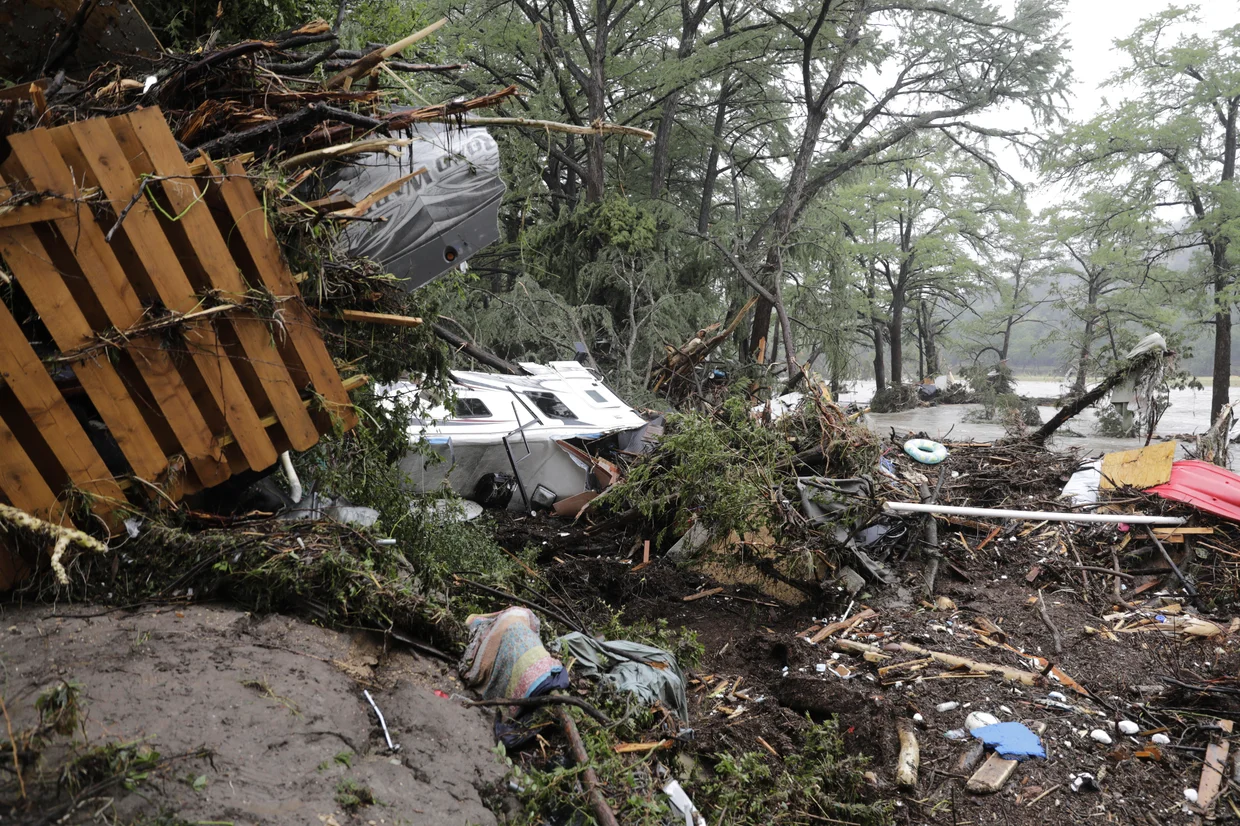 Damaged vehicles and debris are seen roped off near the banks of the Guadalupe River after flooding in Ingram, Texas, Friday, July 4, 2025.