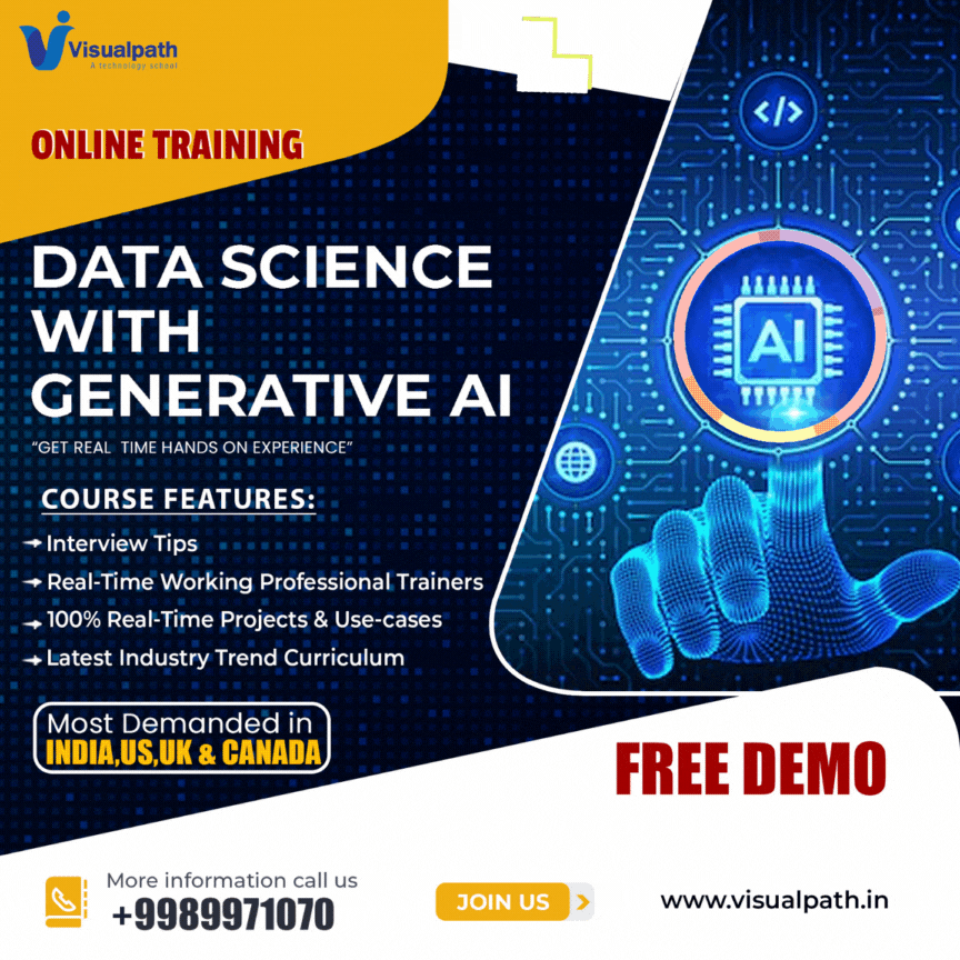 Visualpath is one of the best DataScience with Generative AI Training Hyderabad - India. We are providing Live Instructor-Led Online Classes delivered by experts from Our Industry. We will provide Online Training, live project training after course completion. Enroll Now!! Contact us +91-9989971070.