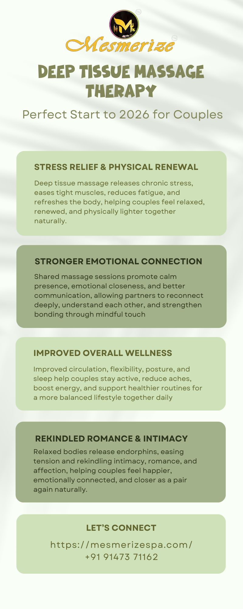 Deep tissue massage helps couples release stress, ease muscle tension, and reconnect mentally and physically, making it an ideal wellness ritual to welcome the new year together with renewed energy. Choosing deep tissue massage in Kolkata allows couples to enjoy expert techniques in a calming environment. Experience this therapy at Mesmerize Spa. Start 2026 feeling relaxed and refreshed together.