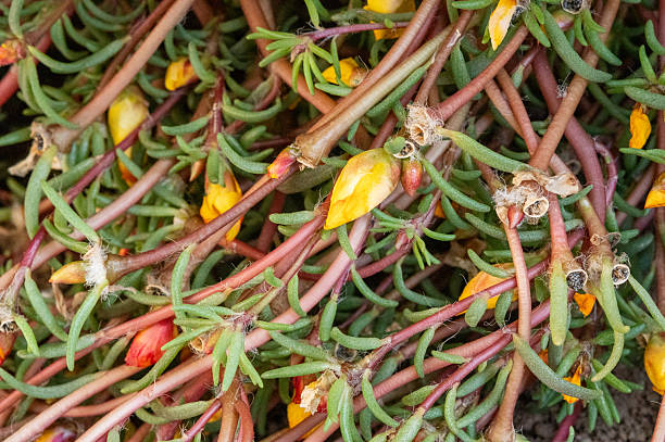 Delicate moss rose buds, flowers, and seed pods growing on green and red stems in summer