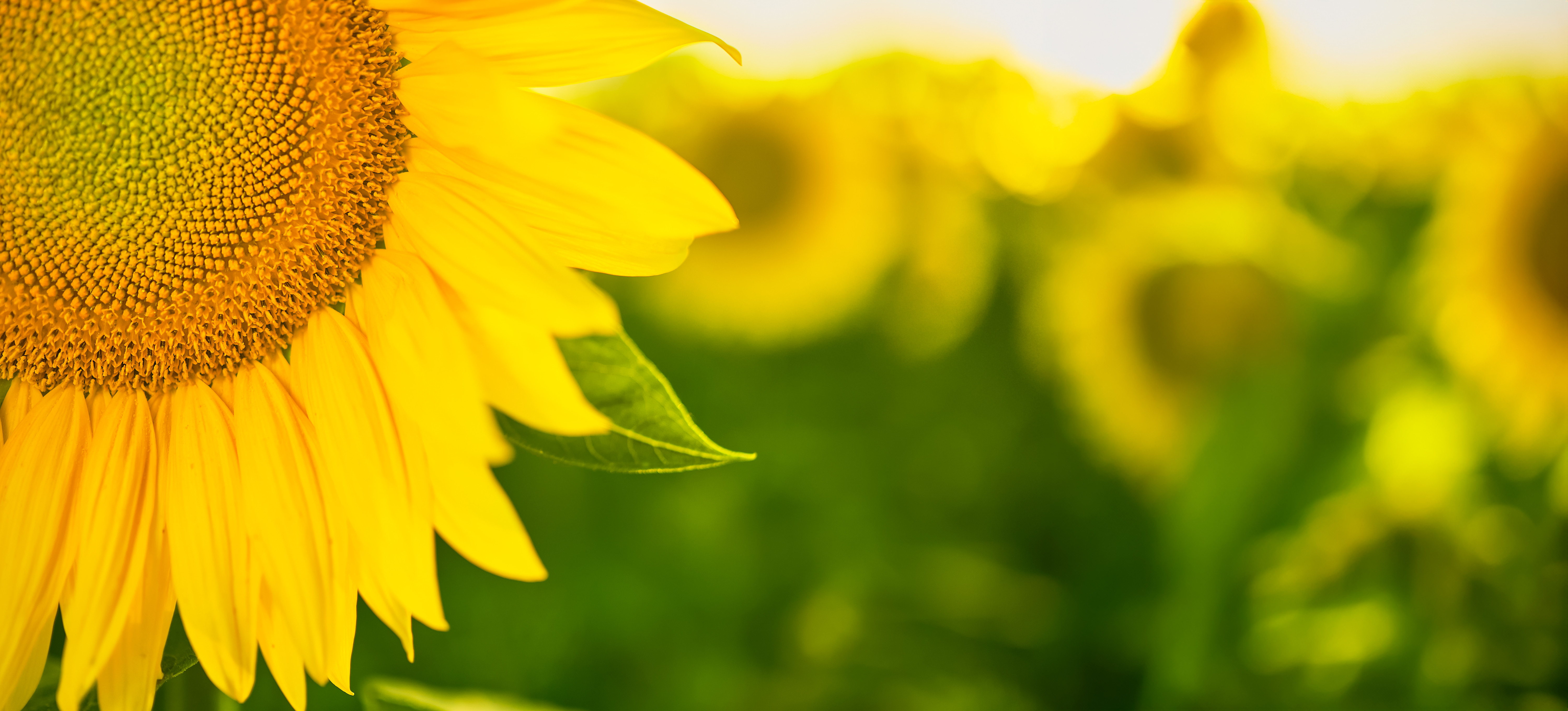 detail blooming sunflower field selective focus closeup with free space text idea