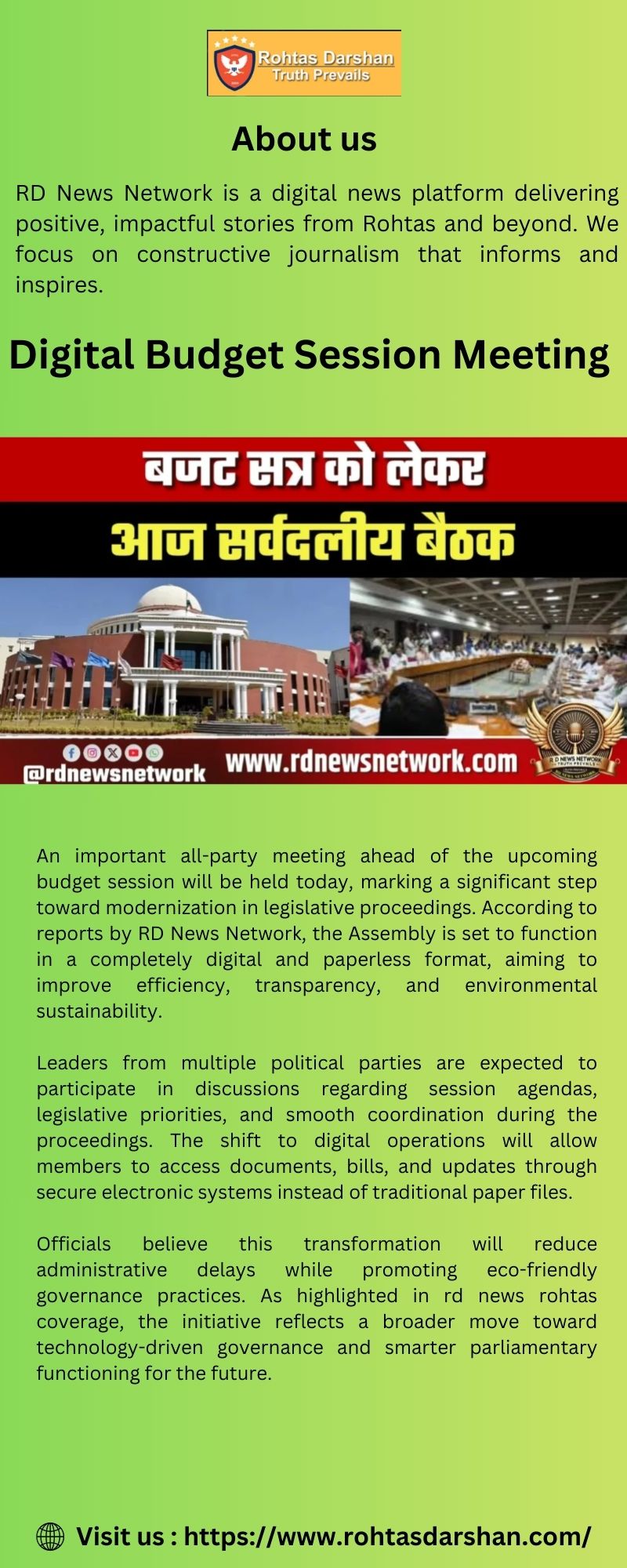 According to reports by RD News Network, an important all-party meeting will be held today ahead of the upcoming budget session. The government has announced that this year’s Assembly proceedings will be fully digital and paperless, marking a significant step toward modern governance and environmental responsibility. Lawmakers will use electronic devices to access documents, bills, and discussions in real time, reducing paper usage and improving efficiency. Political leaders from multiple parties are expected to attend the meeting to discuss agenda priorities and ensure smooth functioning during the session. As highlighted in rd news rohtas coverage, the initiative aims to enhance transparency, speed, and accessibility in legislative operations.