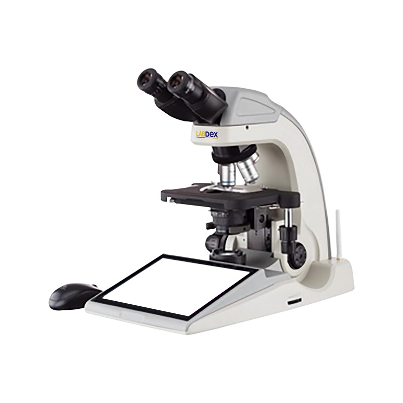 Labdex Digital Microscope features an LCD TFT touch screen for high resolution specimen viewing with reduced eye strain. Equipped with infinity-corrected optics, built-in Wi-Fi, a mechanical stage, LED illumination, precise focusing, and an Abbe condenser, it supports analysis in bacteriology and medical research.
