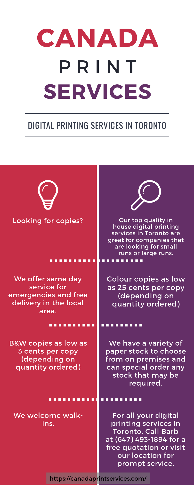Our top quality in-house digital printing services in Toronto are great for companies that are looking for small runs or large runs. We offer same day service for emergencies and free delivery in the local area. https://canadaprintservices.com/digital-print-services/