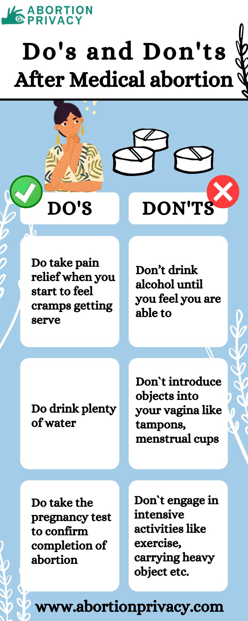 Thinking about what to do after a medical abortion? Here are some tips you can follow. Remember to rest, hydrate, and follow your doctor's advice. Avoid intensive activities and don`t use tampons or menstrual cups you can go for pads instead.