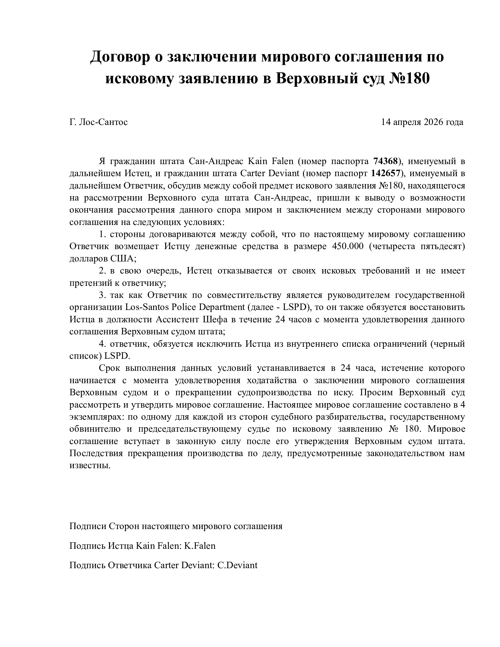 Договор о заключении мирового соглашения по исковому заявлению в Верховный суд