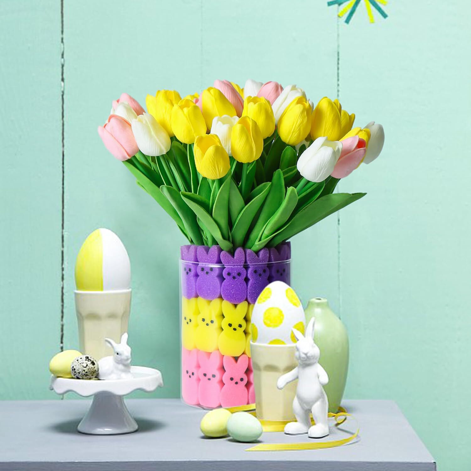 Easter Decorations Easter Little Bunnies Decor 15 pcs Artificial Tulips with 48 pcs Bunnies Vase Fil