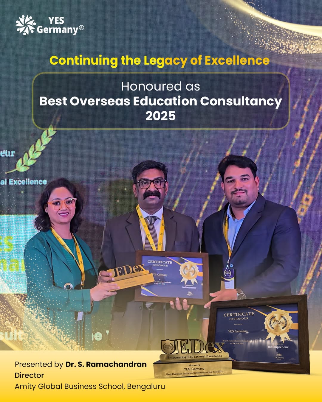 This image captures a key moment from the EDex Awards 2025 in Bengaluru, where YES Germany was acknowledged for its contribution to overseas education advising. The recognition, conferred by Dr. S. Ramachandran, Director at Amity Global Business School, reflects a continued focus on responsible guidance and transparent processes for students planning higher education abroad. An achievement that resonates with its standing as a Top Study Abroad Consultant in Pune.