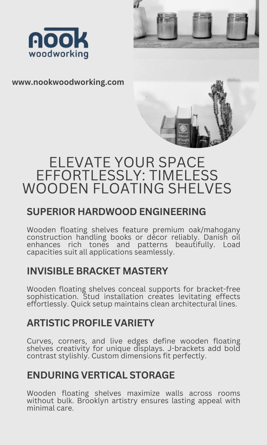 Transform interiors with Nook Woodworking’s wooden floating shelves, offering heavy-duty strength and minimalist elegance in live edge, grommet-equipped, and visible bracket styles. Custom sizing ensures airy organization without floor clutter, suiting any aesthetic from industrial to Scandinavian. Rot-resistant woods promise durability, while free U.S. shipping delivers heirloom quality directly.