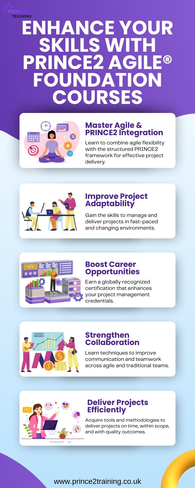 Advance your project management career with PRINCE2 Agile® Foundation Courses. This comprehensive training equips you with the knowledge to manage projects using both agile and PRINCE2 frameworks. Learn to deliver high-quality projects on time while adapting to changing environments. Suitable for beginners and experienced professionals, these courses provide the foundation for effective, flexible project delivery. Enroll now and become a certified PRINCE2 Agile® practitioner!