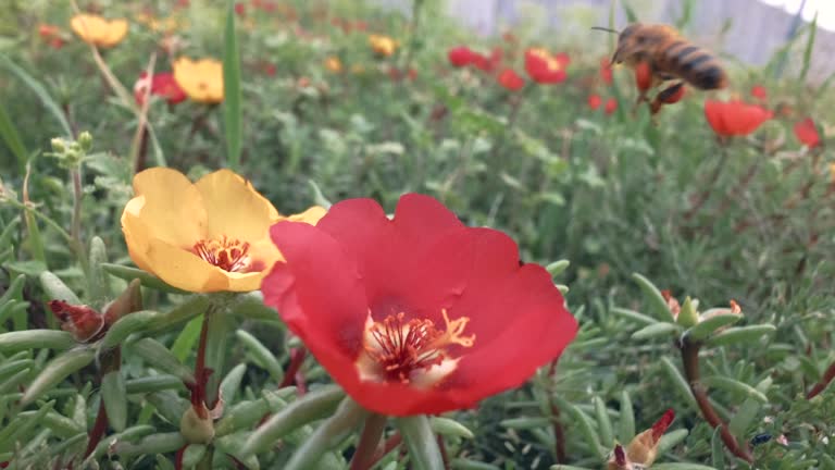 Entomology concept. Insect in wild nature, pollination process, slow motion. Bee flying around pursl