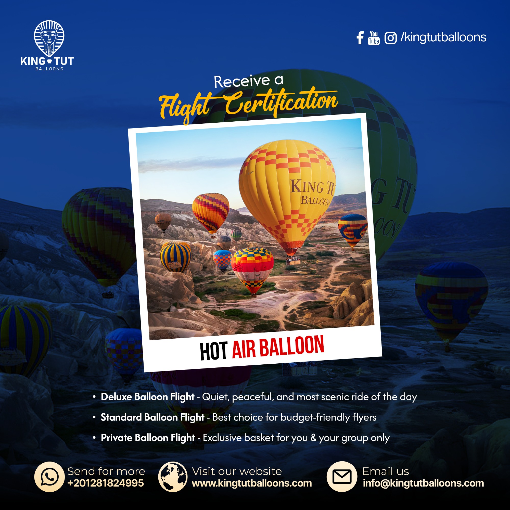 Soar above stunning landscapes in a peaceful hot air balloon flight and experience views you’ll remember for a lifetime. Book your balloon ride now : https://kingtutballoons.com/tour/deluxe-flights/