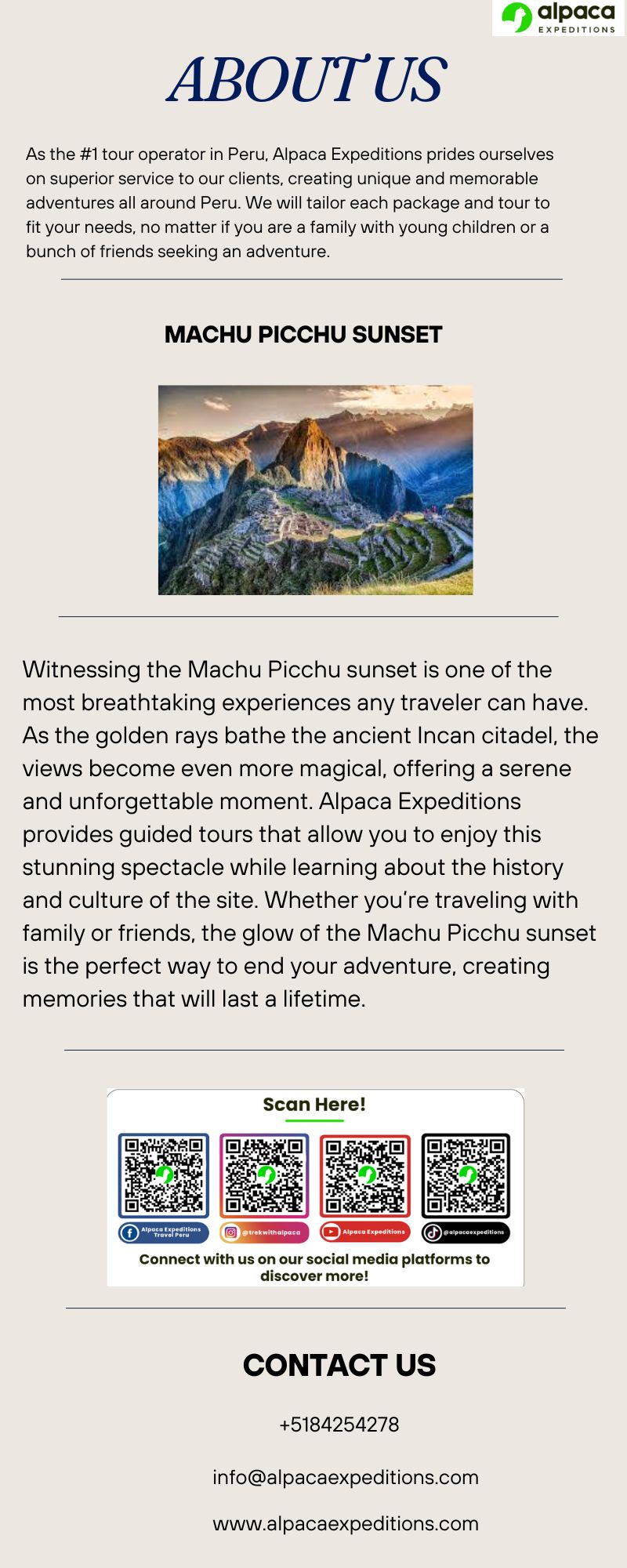 Witnessing the Machu Picchu sunset is one of the most unforgettable experiences for any traveler exploring Peru. As the golden rays illuminate the ancient Incan citadel, the breathtaking view creates a perfect blend of history, culture, and natural beauty. Alpaca Expeditions provides this unique opportunity, ensuring travelers enjoy the magical atmosphere while learning about the rich heritage of the site. Whether you’re an adventurer or a history lover, watching the Machu Picchu sunset offers serenity and wonder, making it the highlight of your journey through the Andes with trusted experts guiding the way.