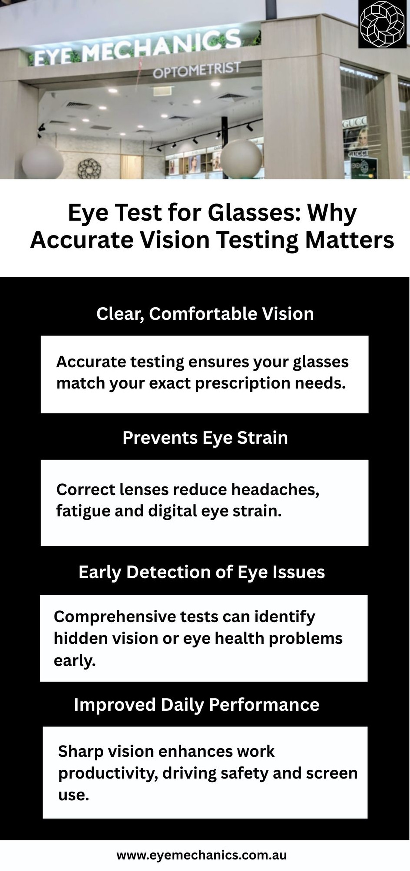Eye Mechanics is a trusted eye clinic in Sydney, offering top-quality vision care with the latest testing tools and treatments tailored to your needs. We provide comprehensive eye check-ups, assistance with contact lenses, dry eye care, eye exams for individuals with diabetes, strategies to slow down near-sightedness, eye care for children, and vision tests for drivers. We make sure everyone gets the right eye care, no matter their age. Website: https://eyemechanics.com.au/