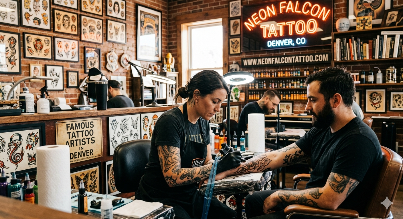 Explore works by famous tattoo artists in Denver at Neon Falcon Tattoo. Unique styles, award-winning artists, and custom tattoos to match your vision.