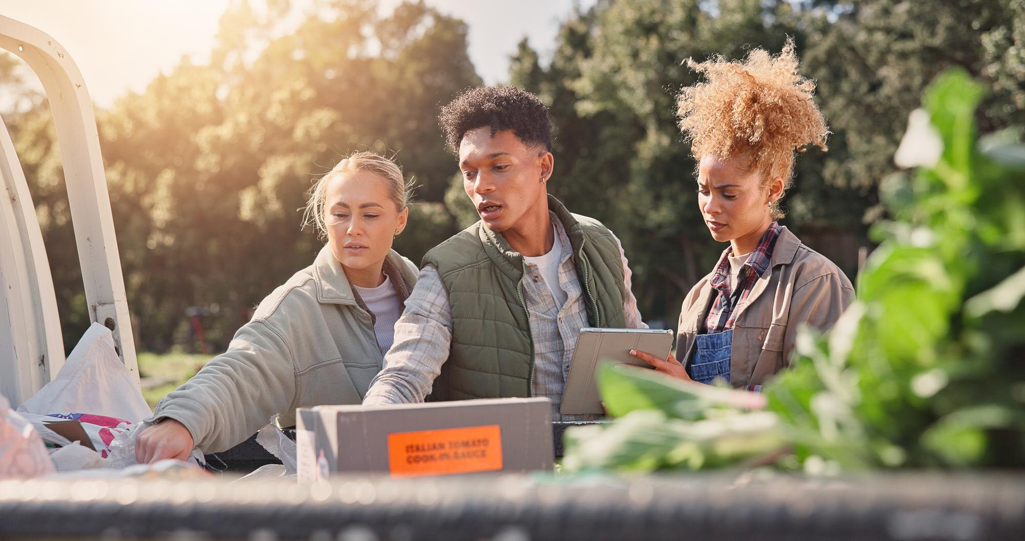 farming tablet crops with people truck vegetable logistics supply chain inspection delivery agricult