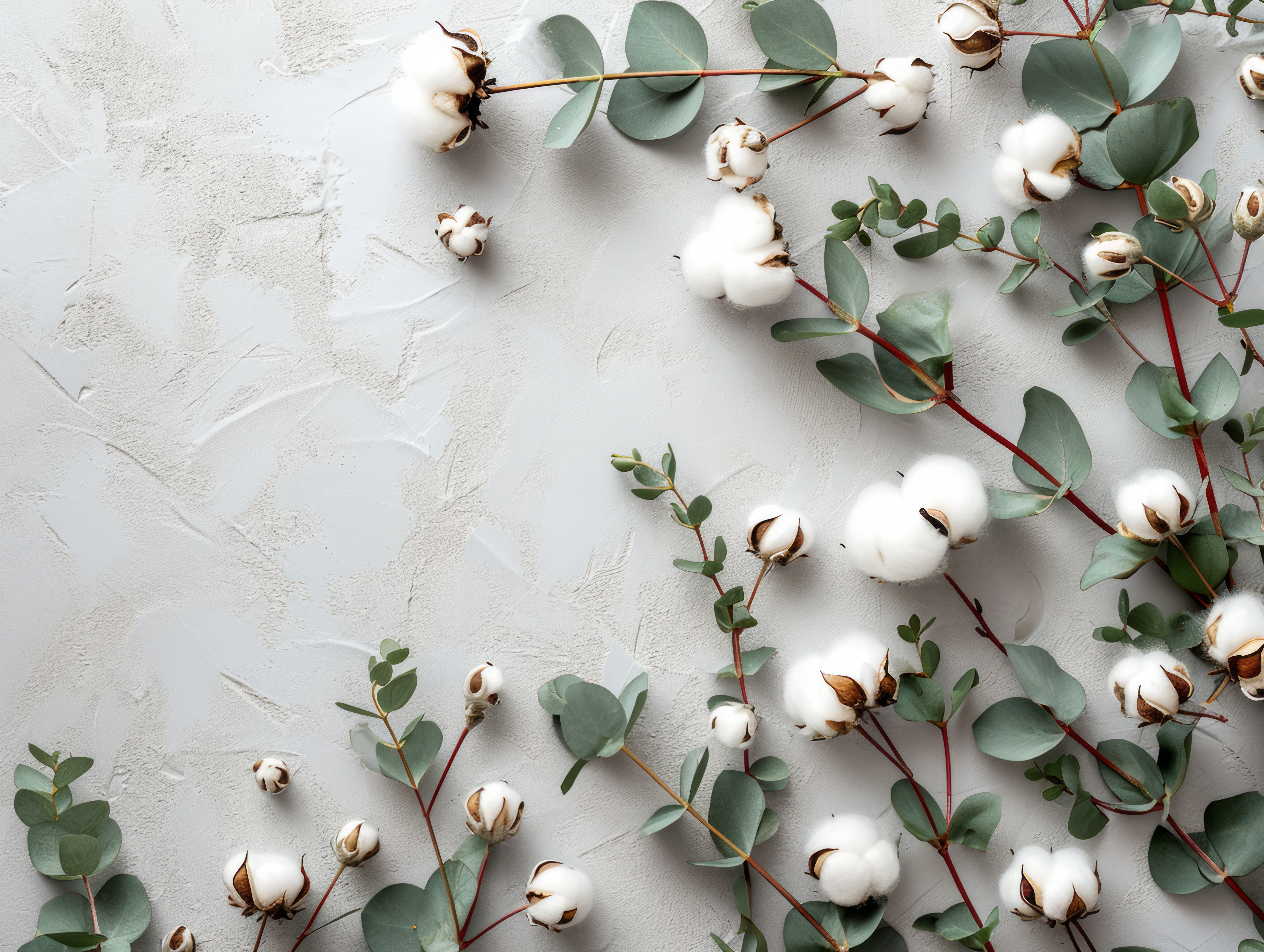 Flat lay flowers composition Cotton flowers and fresh eucalyptus twigs on light gray background Top