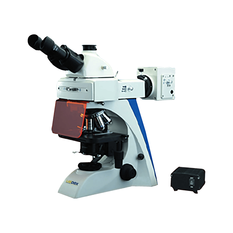 Labdex Fluorescence Microscope LX1302FMS features an epi-fluorescence system with a binocular/trinocular head for clear fluorescent imaging. Includes digital camera support for photos and live video, Kohler halogen illumination, Abbe 1.25 NA condenser, coaxial focus, quintuple nosepiece, and mechanical stage.