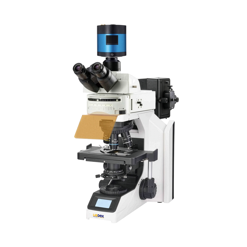 Labdex Fluorescence Microscope features a 20 MP digital camera, infinity-corrected optics, and a Seidentopf trinocular head for comfortable viewing. It includes an LCD display, ECO mode, built-in filters, Peltier cooling up to -42°C, an Abbe NA 0.9 condenser, and 3W LED illumination for pathology and research.