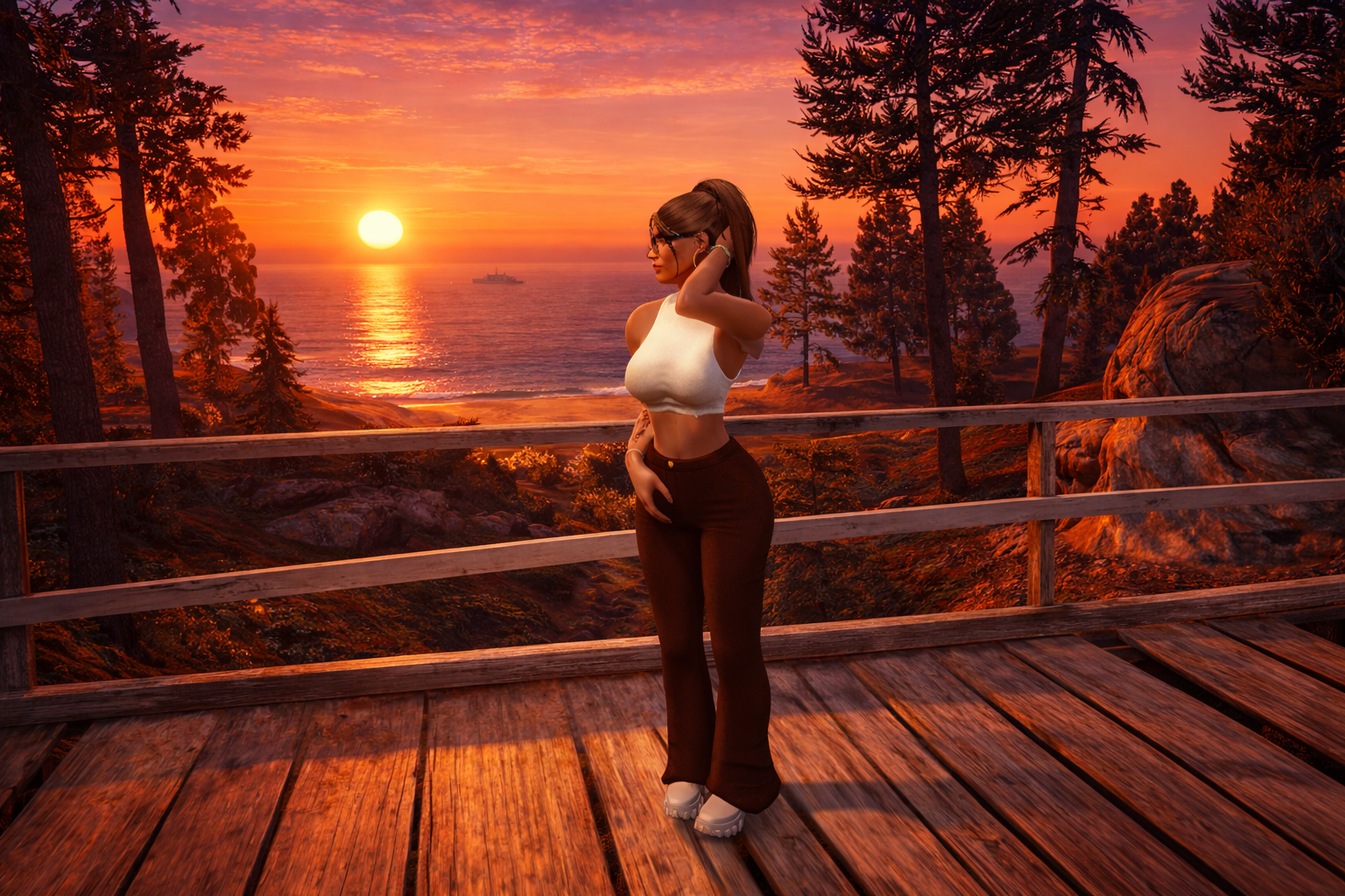 Frau auf Aussichtsterrasse beim Sonnenuntergang