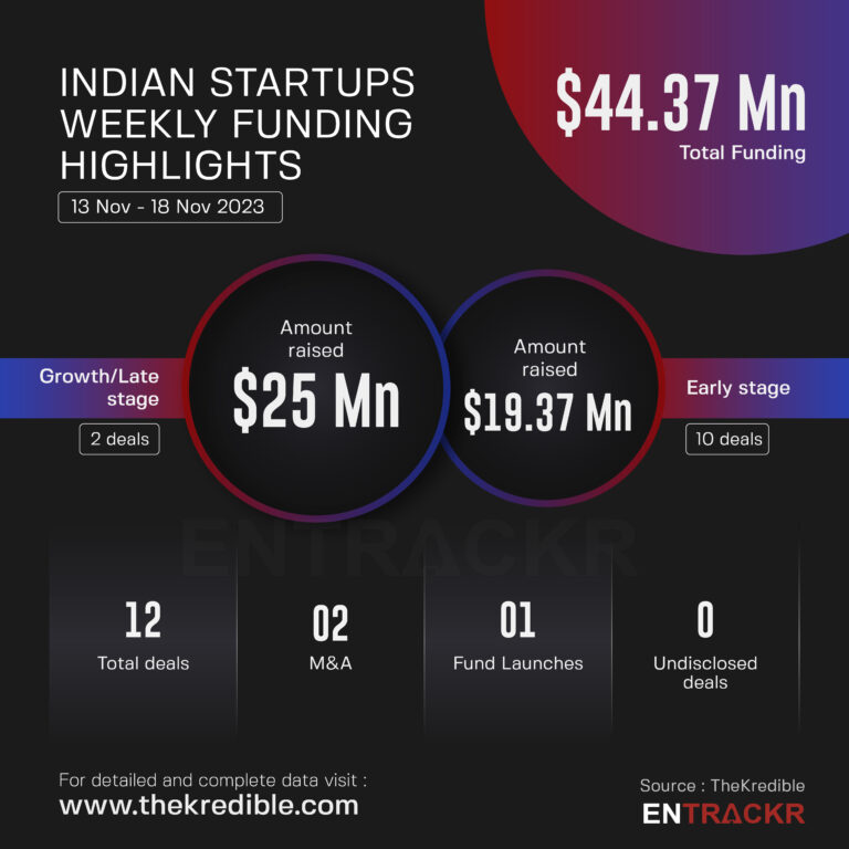 This week, the Indian startup ecosystem witnessed only 12 funding deals raising $44.37 million. Following this, weekly funding dwindled by 78% from $201 million funds raised during the previous week.