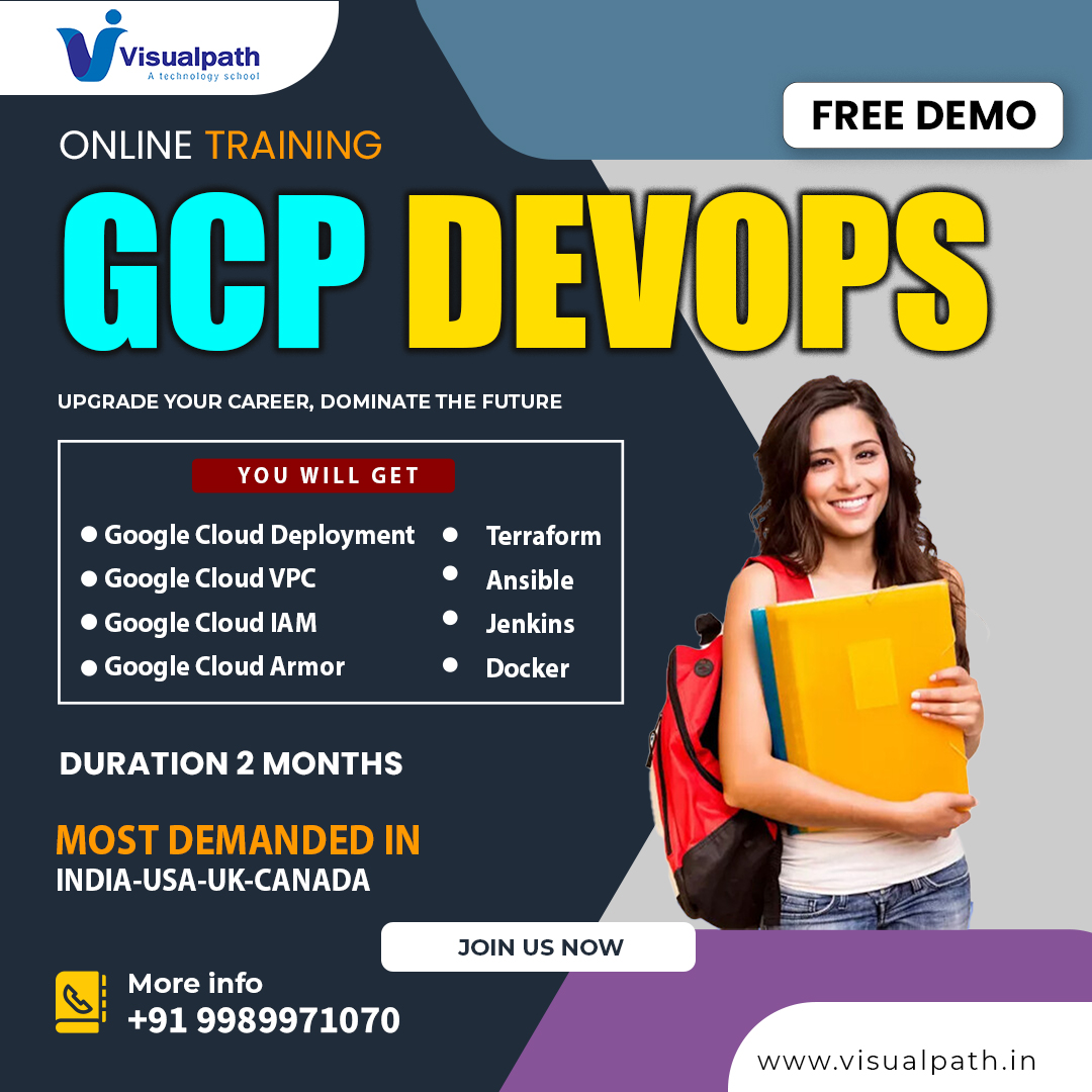 GCP DevOps Training institute in Ameerpet- Visualpath is offering DevOps On Google Cloud Platform Online Training, available worldwide. Learn to use essential GCP tools to automate deployments, manage resources, and enhance software development processes. With step-by-step guidance, you'll gain practical experience in Continuous Integration/Continuous Deployment (CI/CD) and infrastructure as code (IaC). Book A Free Demo at +91-9989971070.