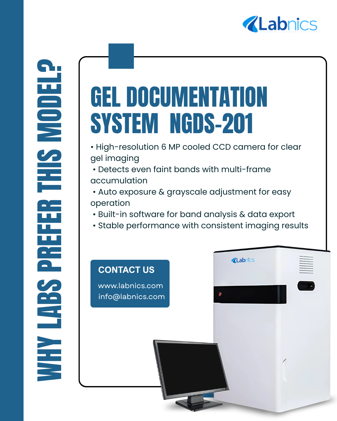 Gel Documentation System NGDS-201 supports high-resolution imaging and analysis of DNA and protein gels with enhanced signal detection. info@labnics.com https://labnics.com/gel-documentation-system/ngds-201 #Labnics #GelDocumentationSystem #GelImaging #MolecularBiology #LabEquipment #DNAAnalysis