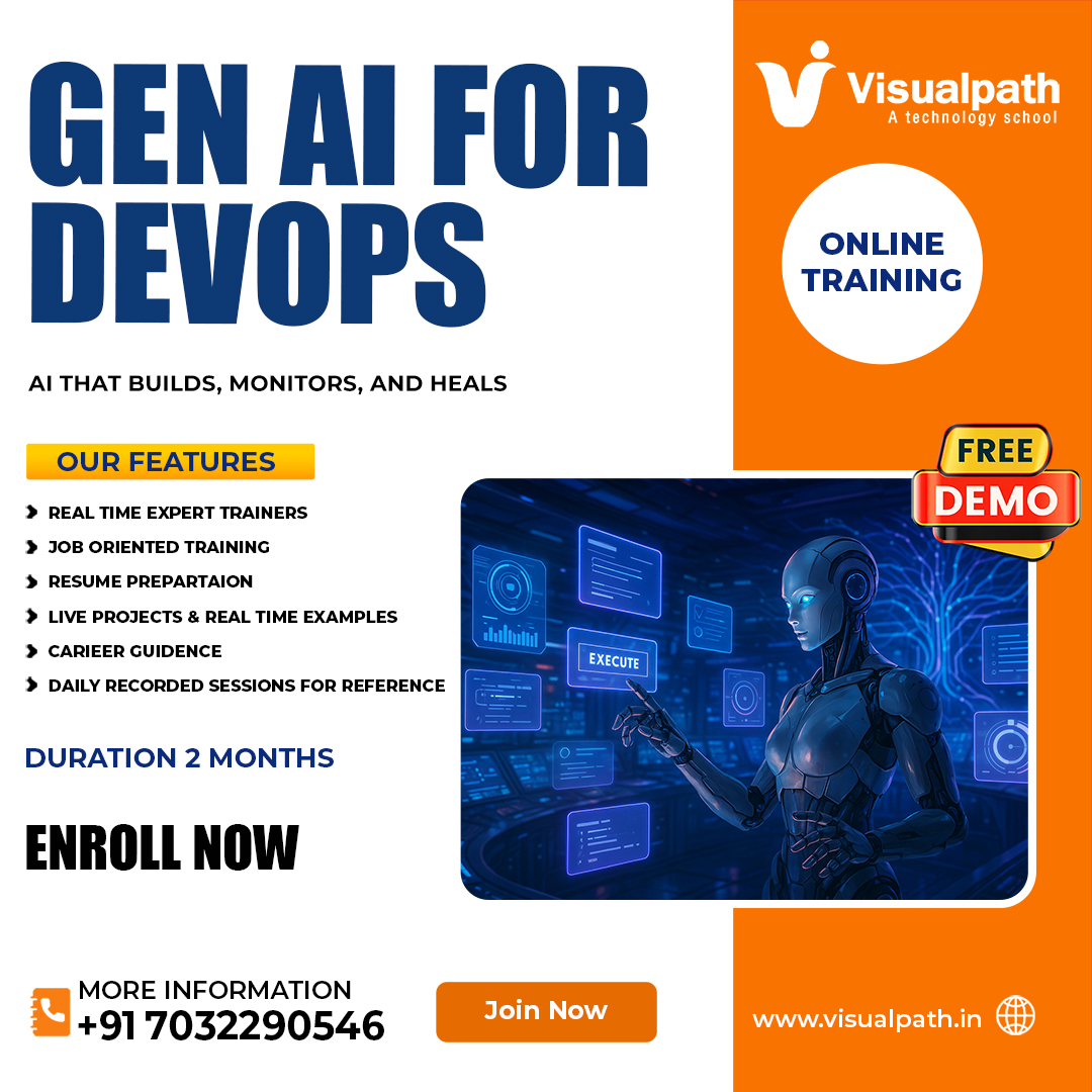 Visualpath offers Generative AI For DevOps Training video, designed to deliver practical, hands-on learning guided by experienced industry professionals. Our Generative AI For DevOps Training India training is available in Hyderabad, Bangalore, Chennai, and also offered 100% online, making it accessible to learners worldwide including the USA, UK, Canada, Dubai, and Australia. For more information, contact us at +91-7032290546.