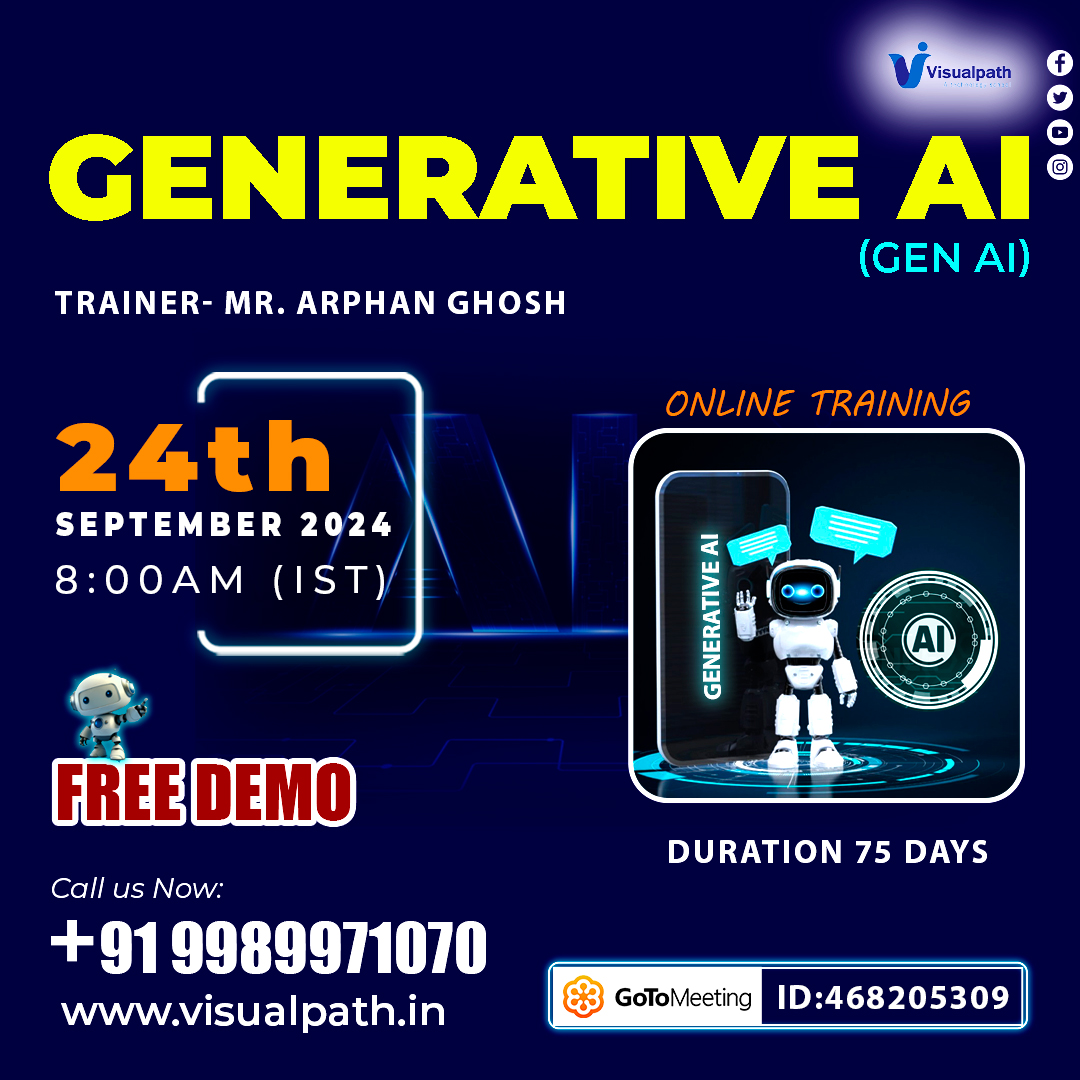Join Now: https://meet.goto.com/468205309 Attend Online #FreeDemo on #GenerativeAI (GenAI) by Mr.Arphan Ghosh. Demo on: 24th SEPTEMBER, 2024 @ 8 AM (IST) Contact us: +91 9989971070. Visit our Blog: https://visualpathblogs.com/ WhatsApp: https://www.whatsapp.com/catalog/919989971070 Visit: https://visualpath.in/generative-ai-course-online-training.html