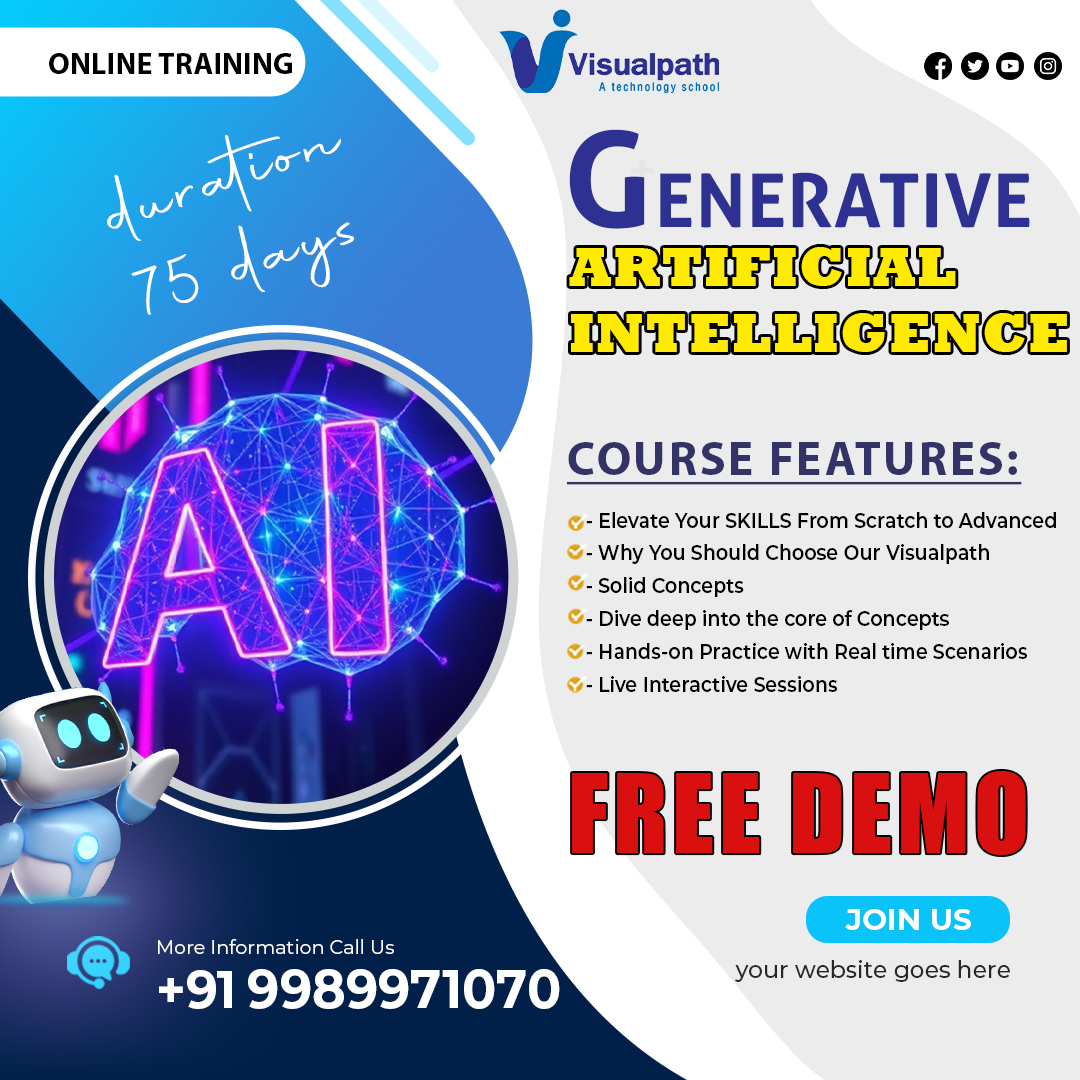 Visualpath GenAI Training (globally) offers an in-depth exploration of AI models such as GPT, GANs, and VAEs, with a focus on text generation, image synthesis, and the ethical considerations surrounding artificial intelligence. To schedule a Free demo, please contact +91-9989971070.