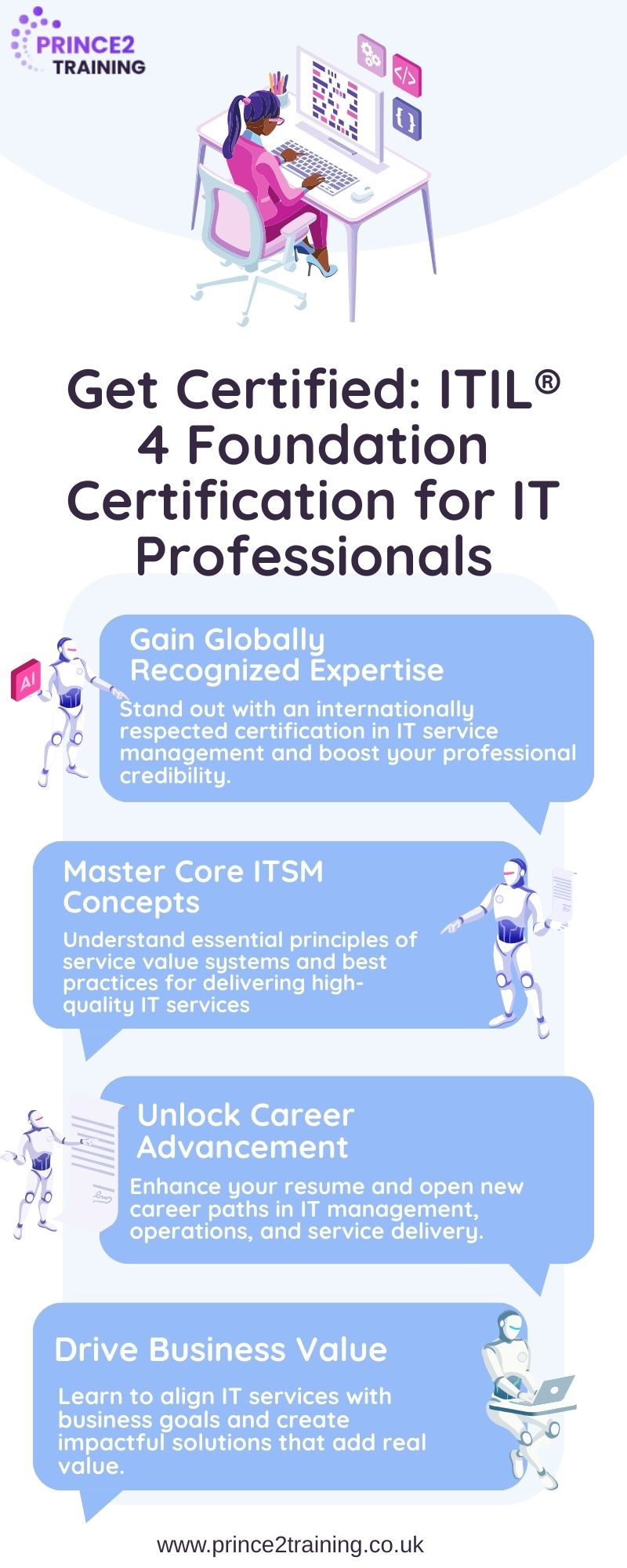 Take the next step in your IT career by earning the ITIL® 4 Foundation Certification. Gain a solid understanding of IT service management principles, improve service efficiency, and become a trusted asset in any organization. Perfect for IT practitioners and aspiring managers, this certification opens doors to global job prospects. Don’t wait—equip yourself with the knowledge to succeed in today’s fast-paced IT landscape!