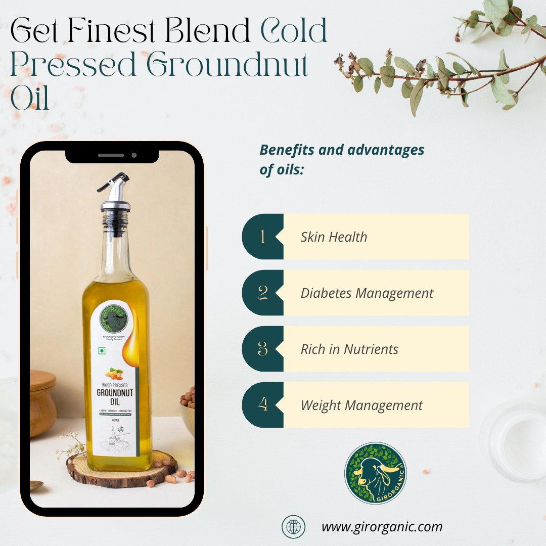 Benefits and advantages of oils: 1. Skin Health 2. Diabetes Management 3. Rich in Nutrients 4. Weight Management Buy Now : https://girorganic.com/products/wood-pressed-groundnut-oil